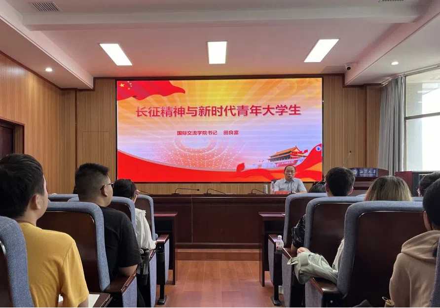 国际交流学院直属支部委员会书记田良富同志作“长征精神与新时代大学生”的主题授课,他从长征历史的意义价值出发,讲述长征英雄的事迹,引导大家追寻长征足迹、感悟长征精神、坚定入党初心。
