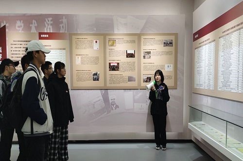 (图为讲解员为同学们介绍湘大校史)