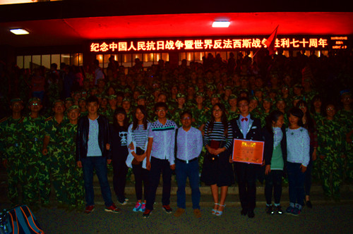 十月十日晚7时30分,由我校团委学生会主办的“纪念中国人民抗日战争暨世界反法西斯战争胜利七十周年百人大合唱比赛”在雄壮的《义勇军进行曲》中拉开帷幕。出席本次比赛的领导有副校长刘建平、学生工作处处长谢罗奇,党委副书记及学工办老师们都到场为同学们加油助阵。同学们热情高涨,比赛现场气氛紧张又活跃。