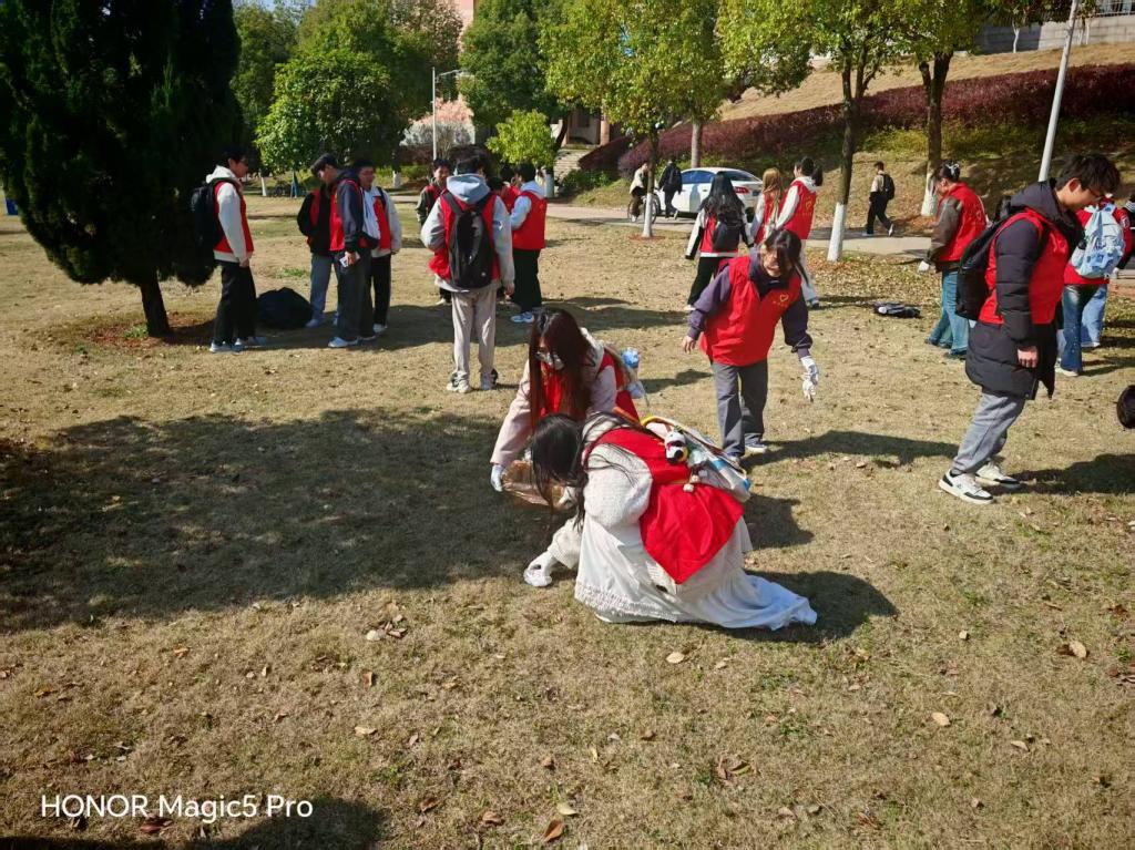 活动当日,志愿者们带着手套、环保袋等工具,分成两个小组展开行动。在学校大门口,志愿者们弯腰仔细检查花坛边缘和地砖缝隙,精准地找到藏匿的烟蒂、纸屑等细小垃圾。兴湘学院旁的草坪上,志愿者们各自划分区域进行"地毯式"搜索,不放过任何一个隐藏在草丛中的塑料袋、饮料瓶。经过他们的辛勤付出我们的校园逐渐变得干净整洁。