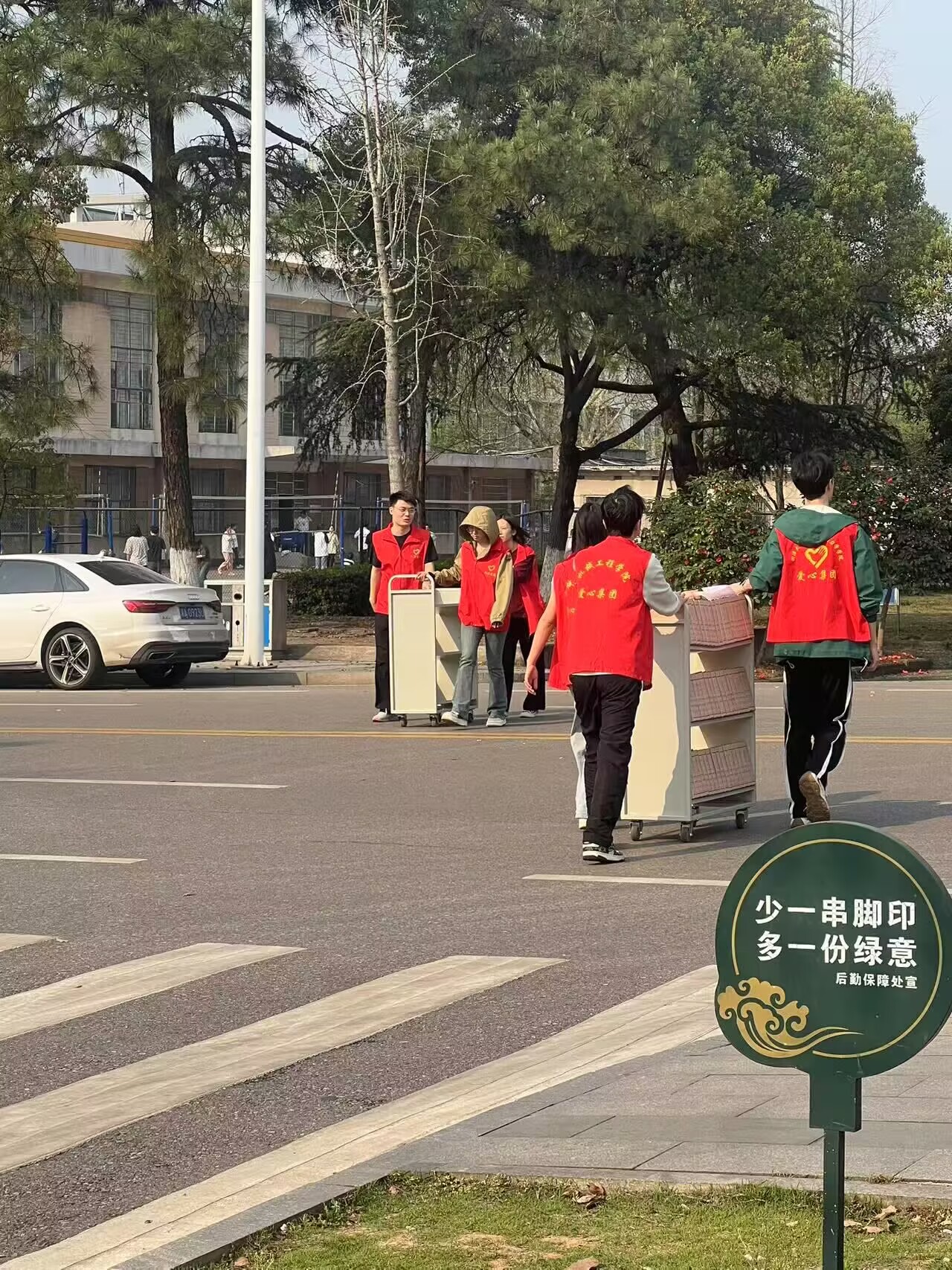 在初春的阳光中,一车车运输的过程让志愿者们在这个季节挥汗如雨,但是没有任何一个志愿者停下自己的脚步,他们互帮互助,携手前进。经档案馆工作人员统计,本次共运输700多册档案,在大家齐心协力之下跨过重重坎坷,到达了他们的“新家”。