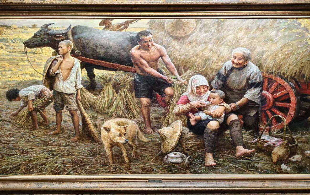 在乡土题材作品展区,描绘乡村劳作、田园日常的画作格外动人。农民们在田间挥汗、孩童在草垛嬉戏的场景,以细腻笔触还原生活本真。那些粗糙皮肤、质朴笑容,让团队成员们看见了艺术家对乡土的眷恋,领悟到艺术源于生活,是对平凡日子深情的记录与升华。“人性与爱”主题作品里,展现灾难互助、人间温情的画面撞击心灵。无论是救灾现场人们携手的身影,还是陌生人给予的温暖扶持,都传递出人性光辉。画作跨越视觉审美,使团队成员在共情中汲取向上力量,明白艺术可凝聚社会共识,传递爱与希望 。