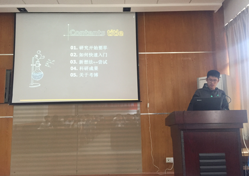 段江哗作了一场题为:《踏实走好三年里的每一步——行动、坚持、改变》的报告。师兄围绕自己三年的研究生生活,结合导师69成人网 团队的研究内容,为我们详细分析了如何在研究生期间进行科学的69成人网 研究,另外,师兄也分享了自己的考博经历,介绍了如何选择适合自己的专业领域,如何考博。