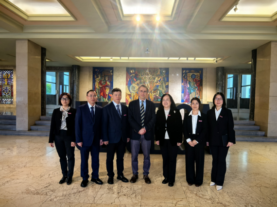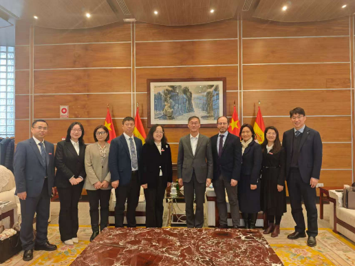 在西班牙马德里,代表团拜会了中国驻西班牙大使姚敬。葛飞详细汇报了我校与西班牙高校合作办学进展、莱昂大学孔子学院建设情况及产学研合作意向。姚敬对我校国际化办学成效予以肯定,表示使馆将积极搭建桥梁,全力支持并拓宽我校与西班牙在教育、科技、文化等领域的交流合作渠道。