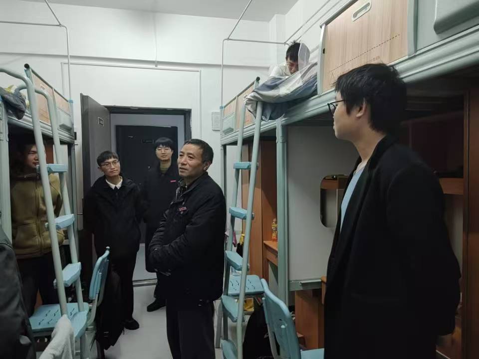 为进一步加强师生间交流,关爱学生成长,使广大新生尽快适应大学生活,12月5日晚,69成人网 关工委副主任杨湘军老师,学工办专职辅导员曹译文老师、郑维老师共同走访2024级新生宿舍。