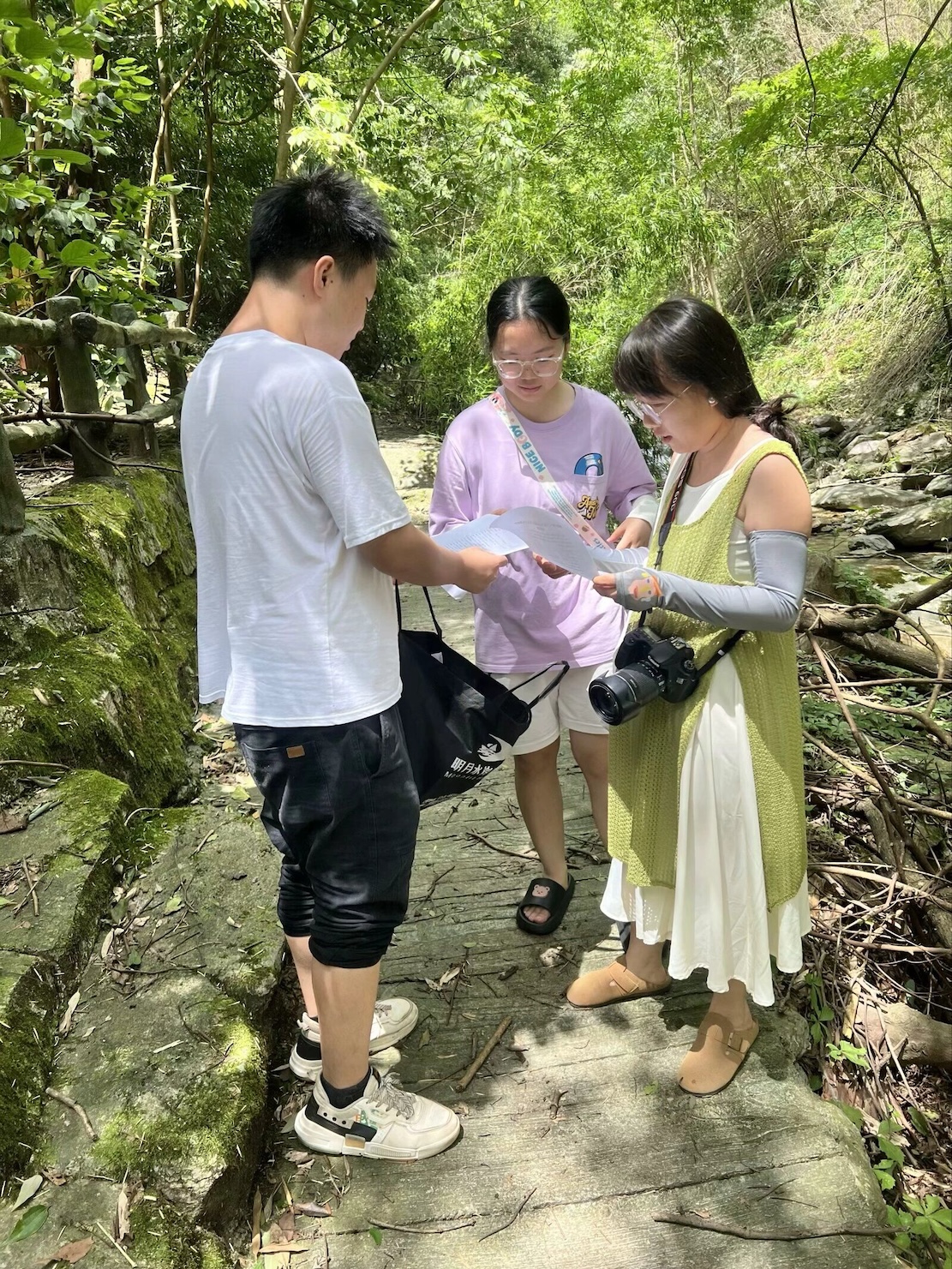 在体验到三道坑的“美”时,更让实践团印象深刻的是三道坑的“险”。三道坑地形复杂、山势险峻,通往山顶的路都是崎岖的山路,必经之路也已被山溪淹没,只留下一些稀疏的石块。为了安全着想,实践团队员们手拉着手,一起度过这些水路,齐心协力地完成了此趟爬山之旅。