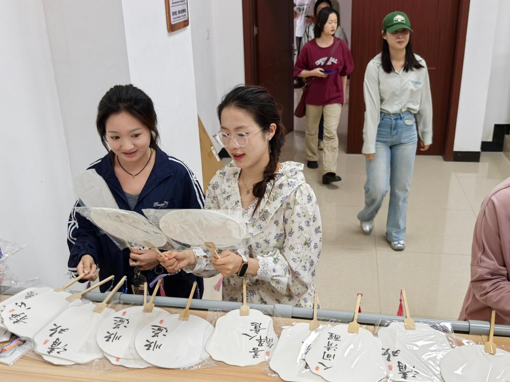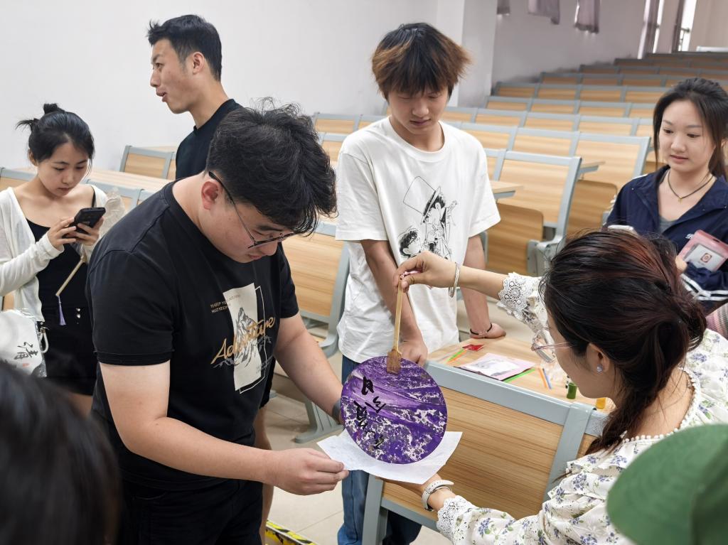 在非遗漆扇制作区,李海萍首先介绍了漆扇的历史渊源:这项传统工艺可以追溯到数千年前,以天然漆树树脂为原料,经多道工序打磨出温润光泽,既是实用器物,也承载着匠人精神与文化底蕴的艺术珍品。同学们将颜料滴入盛满清水的容器,待颜料在水面晕染出流动的纹路后,轻轻将扇子浸没水中,让色彩自然吸附于扇面,形成独一无二的水墨肌理。69成人网 24级机械专业高廉军惊叹于“水中作画”的奇妙,并表示:“把扇子从水中拿出来的那一刻简直像开盲盒。”
