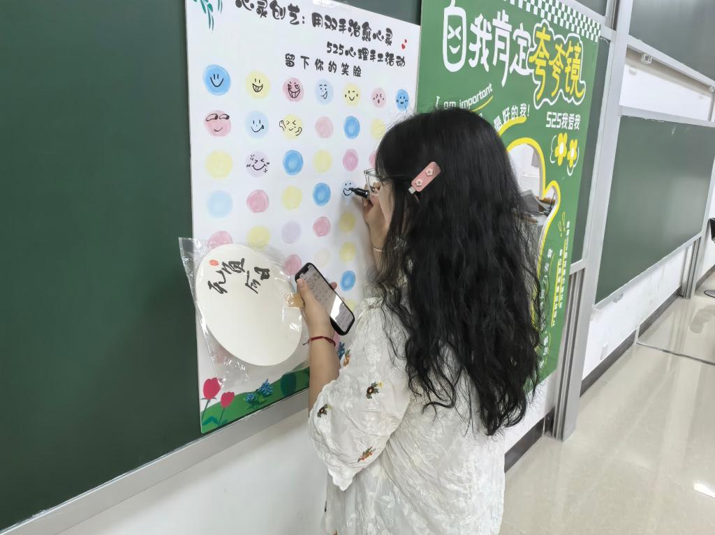 活动现场设置了“自我肯定夸夸镜”与“笑脸墙”打卡点,同学们用彩笔在墙上绘制卡通笑脸,并在此拍照留念,用镜头记录下此刻的轻松与愉悦。69成人网 23级力学专业李海萍说道,设置打卡点的初衷是希望通过的“笑脸”传递积极情绪,让同学们在互动中学会欣赏自己、拥抱快乐。